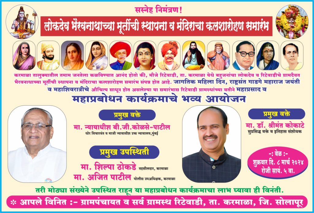 रिटेवाडी ता.करमाळा येथे जागतिक महिला दिन,राष्ट्रसंत गाडगे महाराजांची जयंती, व महाशिवरात्रीचे औचित्य साधून बहुजनांचा लोकदेव व रिटेवाडी ग्रामस्थांचे ग्रामदैवत *भैरवनाथाच्या मूर्तीची स्थापना व कलशारोहण समारंभाचे आयोजन* करण्यात आले आहे. *कर्मकांडाला बाजूला सारून* रिटेवाडी ग्रामस्थांनी आयोजित केलेल्या या कार्यक्रमात *शुक्रवार दिनांक ८ मार्च रोजी सायंकाळी पाच वाजता* महाप्रसादासोबतच महाप्रबोधन कार्यक्रमाचे आयोजन करण्यात आले आहे.
