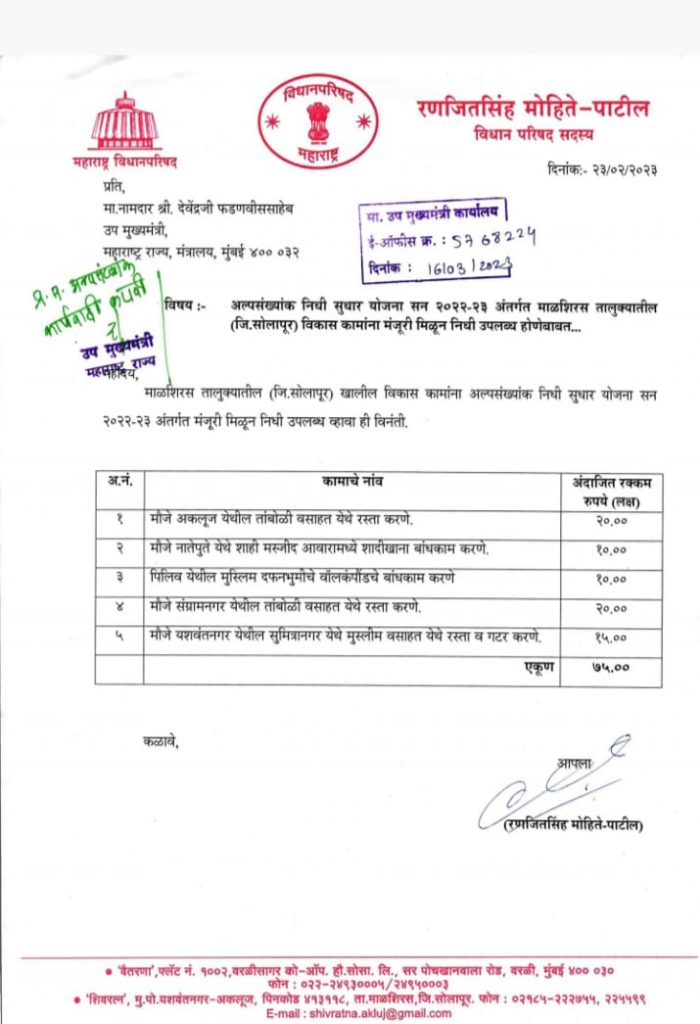 अल्पसंख्यांक निधी सुधार योजना सन 2022/ 23 अंतर्गत सोलापूर जिल्ह्यातील माळशिरस तालुक्यात विकास कामांना मंजुरी मिळून निधी उपलब्ध होण्यासाठी आमदार रणजितसिंह मोहिते पाटील यांनी राज्याचे उपमुख्यमंत्री देवेंद्र फडणवीस यांच्याकडे एकूण 75 लाख रुपये निधीची मागणी निवेदनाद्वारे केली असून त्यामध्ये