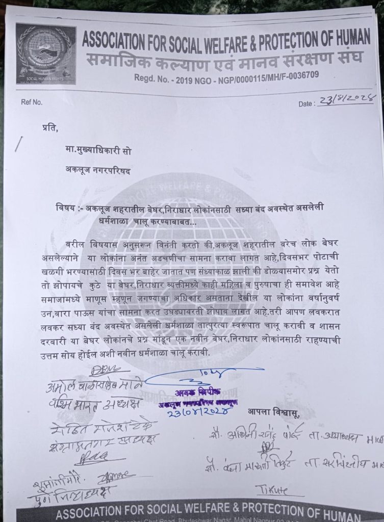 समाजामध्ये माणूस म्हणून जगण्याचा अधिकार असताना देखील या लोकांना वर्षानुवर्षे उन वारा पाऊस यांचा सामान करत उघड्यावरती झोपाव लागत आहे तरी आपण लवकरात लवकर सध्या बंद अवस्थेत असलेली धर्मशाळा तात्पुरत्या स्वरूपात चालू करावी व शासन दरबारी या बेघर निराधार लोकांनचे प्रश्न मांडून एक नवीन बेघर लोकांना निराधार साठी राहण्याची उत्तम सोय होईल अशी नविन धर्मशाळा चालू करावी अशी मागणी अकलूज नगरपरिषदचे मुख्याधिकारी श्री दयानंद गोरे यांच्याकडे केली आहे