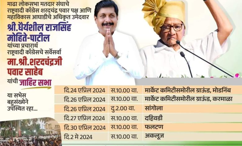 धैर्यशील मोहिते यांच्या प्रचारार्थ शरद पवार यांची मोडनिंब येथे जाहीर प्रचार सभा… अनेक राजकीय धुरंदर करणार राष्ट्रवादी काँग्रेस पार्टी मध्ये प्रवेश…