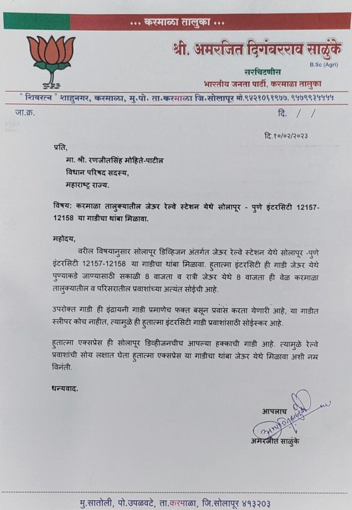 विशेष म्हणजे हुतात्मा एक्सप्रेस ही सोलापूर डिव्हीजनची आपल्या हक्काची गाडी आहे. त्यामुळे रेल्वे प्रवाशांची सोय लक्षात घेता हुतात्मा एक्सप्रेस या गाडीचा थांबा जेऊर येथे मिळावा अशी मागणी श्री साळुंके यांनी या निवेदनात केली आहे.