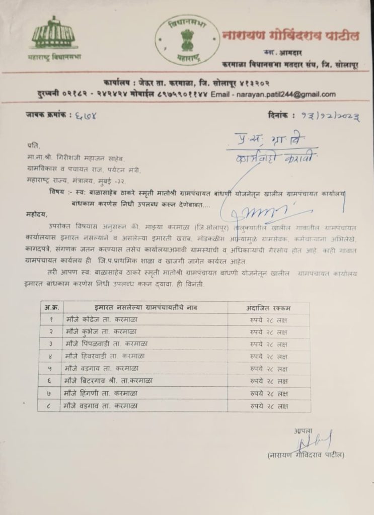 ही जनतेची दिशाभूल करण्याचा प्रकार आहे. करमाळा तालुक्यातील काही गावांमध्ये ग्रामपंचायत कार्यालय नसल्याने अथवा उपलब्ध आहे ते जूने आणि धोकादायक झाले आहे अशा आठ गावांसाठी प्रत्येकी २८ लाख रुपये निधी मिळावा म्हणुन आपण शासनाकडे मागणी केली होती. यासाठी ग्रामविकास व पंचायत राज मंत्री गिरीश महाजन यांची प्रत्यक्ष भेट घेऊन स्व बाळासाहेब ठाकरे स्मृती मातोश्री ग्रामपंचायत बांधणी योजनेतुन करमाळा तालुक्यातील आठ ग्रामपंचायत साठी निधी मिळावा म्हणुन दिनांक १३ डिसेंबर २०२३ रोजी पत्र (जावक क्रमांक ६७४) पत्र दिले. यावर दस्तुरखुद्द मंत्री महोदयांनी ग्रामविकास सचिव यांना कार्यवाही करावी असे आदेश दिले.