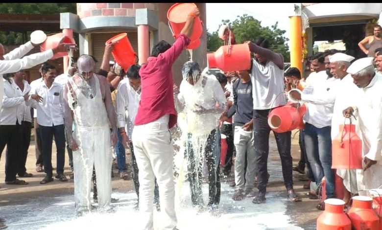 गाईच्या दुधाला 40 रुपये भाव मिळावा यासाठी दूध व उत्पादक शेतकऱ्यांनी घातली दूध डेअरी चेअरमनला दुग्धअभिषेक प्रहारने केलं आंदोलन