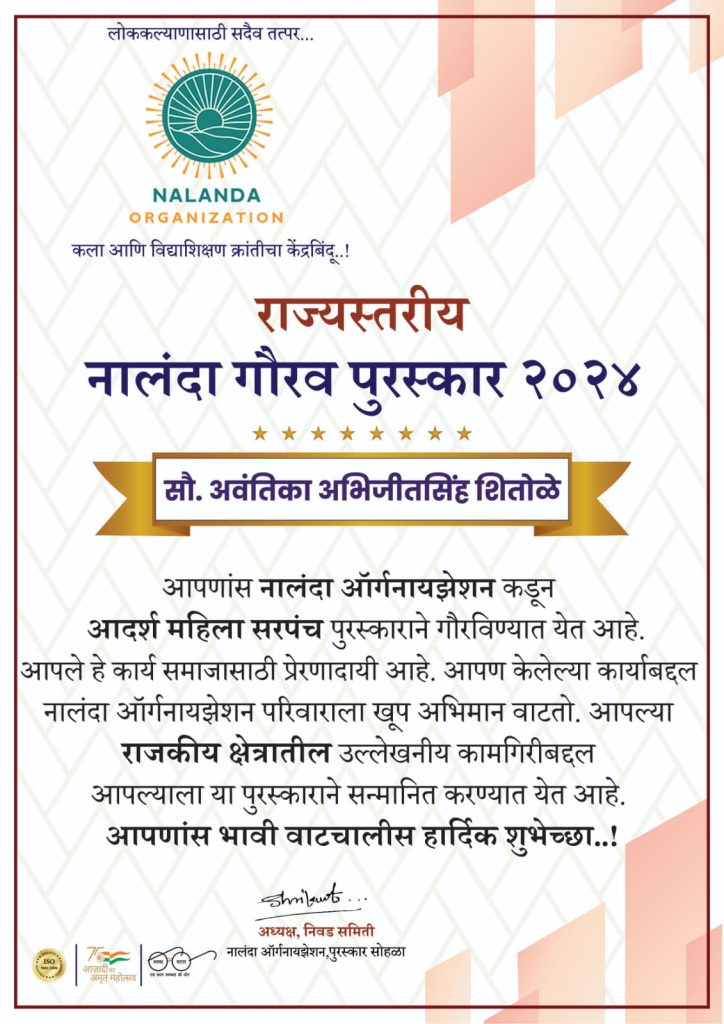 नालंदा ऑर्गनायझेशन हि संस्था 2021-22 सालापासून गाव पातळीवर सर्वेक्षण करून संबंधित पुरस्कारासाठी निवड करत असते.सर्वेक्षणा दरम्यान प्रत्येकाचे गावासाठी असलेले योगदान लक्षात घेऊन त्यांची निवड करण्यात येते….