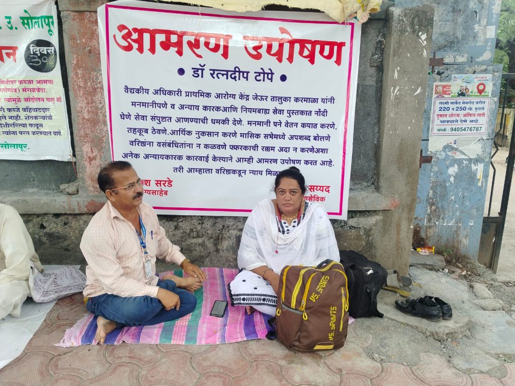 जेऊर येथील प्राथमिक आरोग्य अधिकारी डॉक्टर टोपे यांच्या विरोधात सोलापूर जिल्हा परिषदे समोर दोन आरोग्य कर्मचाऱ्यांचे आमरण उपोषण
