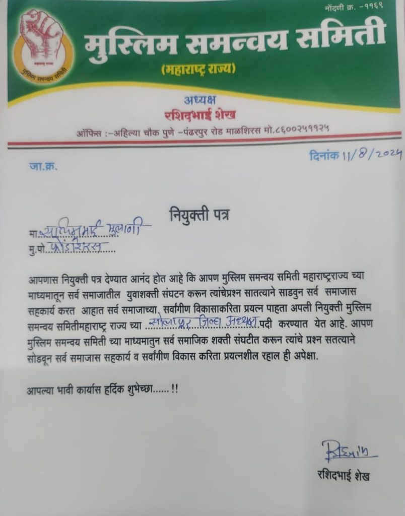 मुस्लिम समन्वय समिती,महाराष्ट्र राज्य सोलापूर जिल्हा अध्यक्ष पदी सलीम मुलाणी…