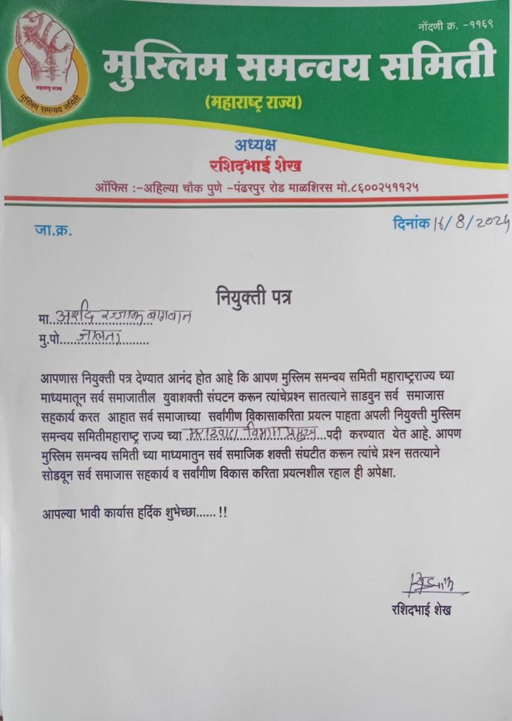 अर्शद बागवान यांचे वडील अ रज्जाक बागवान यांनी दै जालना टाइम्स च्या माध्यमातून जी सामाजिक चळवळ राबवली त्या चळवळीला यशो शिखरावर नेण्याचे काम अर्शद बागवान यांनी केल्यानेच त्यांची निवड मुस्लिम समन्वय समिती,महाराष्ट्र राज्याच्या मराठावाडा विभाग प्रमुख पदी केल्याचे हि रशिद भाई शेख यांनी सांगितले..