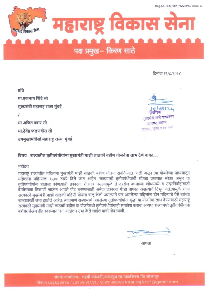 राज्यातील तृतीयपंथीयांना मुख्यमंत्री माझी लाडकी बहीण योजनेचा लाभ देण्याची मागणी राज्य सरकारकडे महाराष्ट्र विकास सेना पक्षाच्या वतीने करण्यात आली आहे.महाराष्ट्र राज्याचे मुख्यमंत्री एकनाथ शिंदे व उपमुख्यमंत्री अजित पवार,देवेंद्र फडणवीस यांना पक्षप्रमुख किरण साठे यांनी त्यांच्या कार्यालयास सदर मागणीचे निवेदन सादर केले आहे.महाराष्ट्र राज्यातील महिलांना मुख्यमंत्री माझी लाडकी बहीण योजना राबविण्यात आली असून त्या योजनेच्या माध्यमातून महिलांना महिन्याला १५०० रुपये दिले जात आहेत.असे निवेदनात म्हटले आहे.