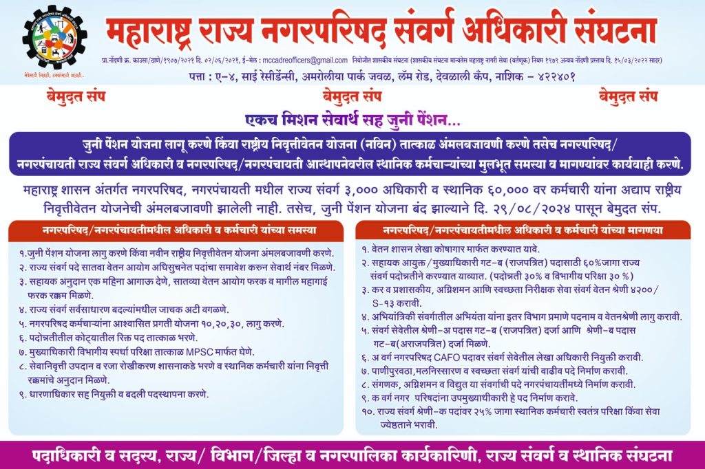 जुनी पेंशन योजना लागू करणे किवा राष्ट्रीय निवृत्तीवेतन योजना (नविन) तात्काळ अंमलबजावणी करणे तसेच नगरपरिषद/ नगरपंचायती राज्य संवर्ग अधिकारी व नगरपरिषद नगरपंचायती आस्थापनेवरील स्थानिक कर्मचार्यांच्या मुलभूत समस्या व मागण्यांवर कार्यवाही करणे या बाबत…