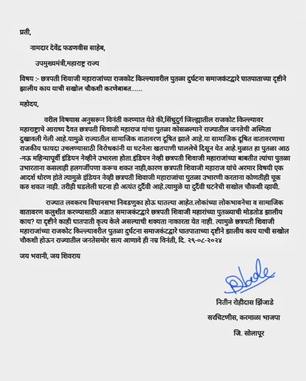 छत्रपती शिवाजी महाराजांच्या राजकोट किल्ल्यावरील पुतळा दुर्घटना समाजकंटकाद्वारे घातपाताच्या दृष्टीने झालीय काय याची सखोल चौकशी करा : नितीन झिंजाडे