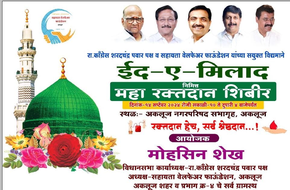 अकलूज येथील मुस्लिम समाजाच्या सामाजिक चळवळीतील कार्यकर्ते आणि शरदचंद्र पवार यांच्या राष्ट्रवादी काँग्रेस पक्षाचे मुस्लिम समाजातील कार्यकर्त्यांनी एकत्र येत भव्य रक्तदान शिबिराचे आयोजन अकलूज नगरपरिषद सभाग्रह येथे केले असल्याचे मोहसिन शेख यांनी सांगितले