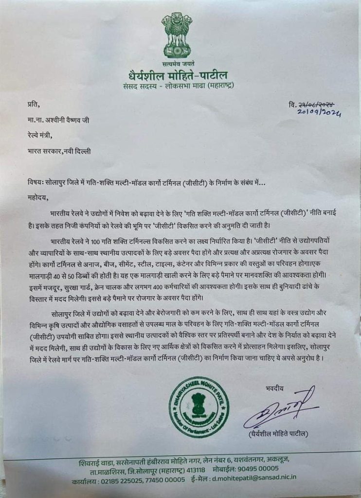 याच बरोबर सोलापूर जिल्ह्यात गतीशक्ती मल्टी-मॉडेल कार्गो टर्मिनल (GCT) उभारणीमुळे जिल्ह्याचा औद्योगिक विकास होईल, आणि रोजगार निर्मितीतही मोठी वाढ होईल. म्हणून, सोलापूर जिल्ह्यातील रेल्वे मार्गावर गतीशक्ती मल्टी-मॉडेल कार्गो टर्मिनल (GCT) उभारण्याची आपण तातडीने कारवाई करावी अशी विनंती मंत्री वैष्णव यांना केली.
