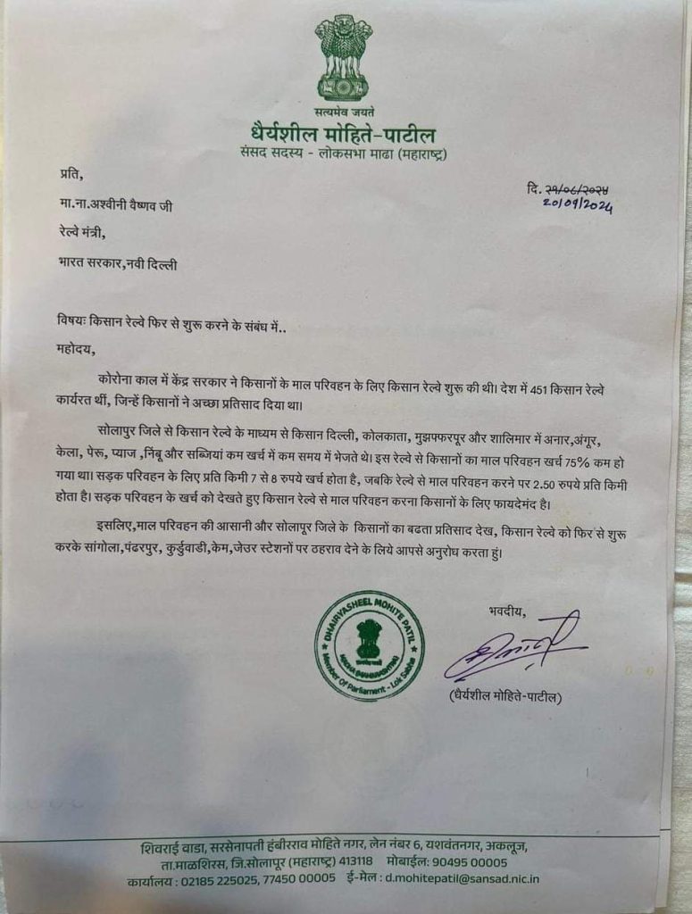 सोलापूर जिल्ह्यातील सांगोला ते बिहार राज्यातील दानापूर किसान रेल्वे पुन्हा सुरू करण्याच्या संदर्भात आग्रही मागणी केली. कोरोना काळात केंद्र सरकारने शेतकऱ्यांच्या मालवाहतुकीसाठी किसान रेल्वे सुरू केली होती. या योजनेला देशभरातील शेतकऱ्यांकडून चांगला प्रतिसाद मिळाला होता. सोलापूर जिल्ह्यातील शेतकऱ्यांनी या रेल्वेचा वापर करून दिल्ली, कोलकाता, मुझफ्फरपूर, आणि शालिमारसारख्या मोठ्या शहरांमध्ये डाळींब, द्राक्ष, केळी, पेरू, कांदा, लिंबू, आणि इतर भाज्यांचे कमी खर्चात आणि कमी वेळेत वाहतूक केली होती. किसान रेल्वेच्या माध्यमातून शेतकऱ्यांचा मालवाहतुकीवरील खर्च 75% कमी झाला होता. रस्ते वाहतुकीसाठी प्रति किलोमीटर 7-8 रुपये खर्च येत असे, तर रेल्वेच्या माध्यमातून मालवाहतूक केल्यास हा खर्च प्रति किलोमीटर केवळ 2.50 रुपये इतका कमी झाला होता. त्यामुळे शेतकऱ्यांसाठी किसान रेल्वे एक फायदेशीर पर्याय बनला होता. या पार्श्वभूमीवर, खासदार धैर्यशील मोहिते-पाटील यांनी केंद्र सरकारकडे किसान रेल्वे पुन्हा सुरू करण्याची आणि सांगोला, पंढरपूर, कुर्डूवाडी , केम, आणि जेऊर या स्थानकांवर या रेल्वेचे थांबे देण्याची मागणी केली आहे.