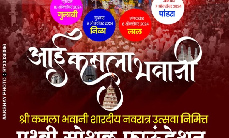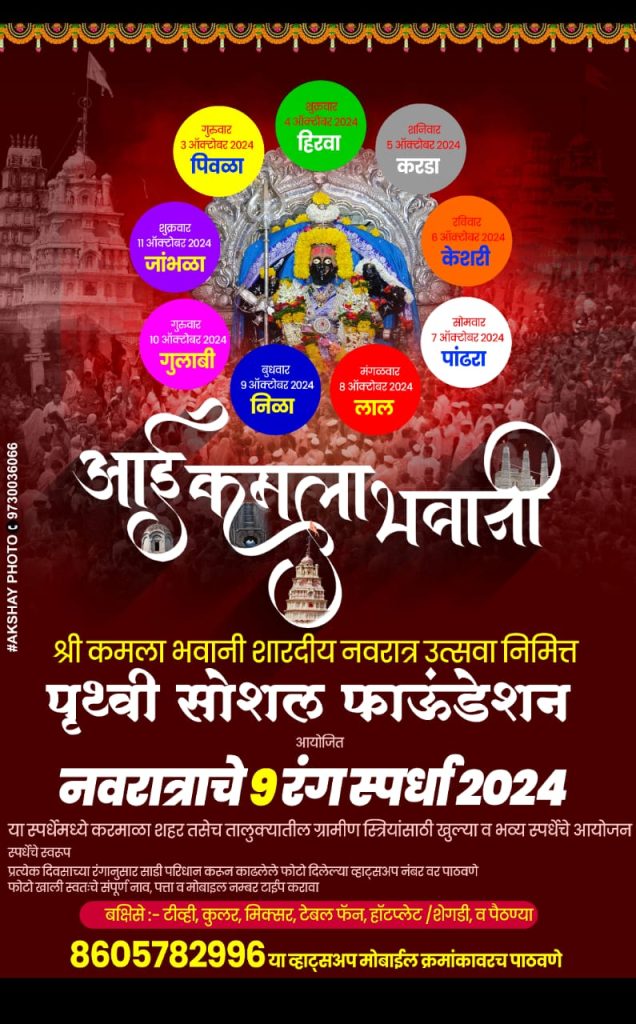 करमाळा येथील पृथ्वी सोशल फाउंडेशन च्या वतीने श्री.कमलभवानी शारदीय नवरात्रौत्सव निमित्त खास महिलांसाठी नवरात्राचे ९ रंग स्पर्धा आयोजित करण्यात आली आहे. सदर स्पर्धा कालावधी ३ ते ११ ऑक्टोबर दरम्यान आहे.