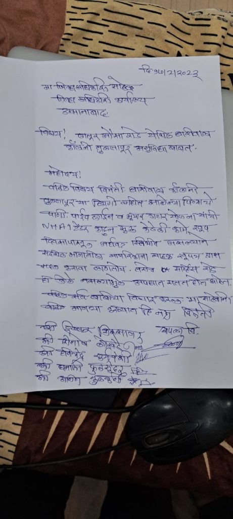 गोकुळ बहुउद्देशीय सोसायटी धारीवाल कॉलनी तुळजापूर.येथील भौतिक सुविधा संदर्भात सर्विस रोड. गटारीचे सांडपाण्याच्या बाबतीत व पिण्याच्या पाण्या बाबत.नगरपरिषद मार्फत पाईपलाईन करणे,या मागणी संदर्भात आज दिनांक,१७ फेब्रुवारी २०२३,रोजी लेखी निवेदन, डॉक्टर सचिन ओम्बासे साहेब जिल्हाधिकारी कार्यालय उस्मानाबाद. यांना निवेदन देण्यात आले आहे,यावेळी माननीय जिल्हाधिकारी यांनी तात्काळ संबंधित अधिकाऱ्याना लेखी आदेश दिले असून तात्काळ चौकशी करून कामे करण्यासाठी आदेश दिले आहेत,