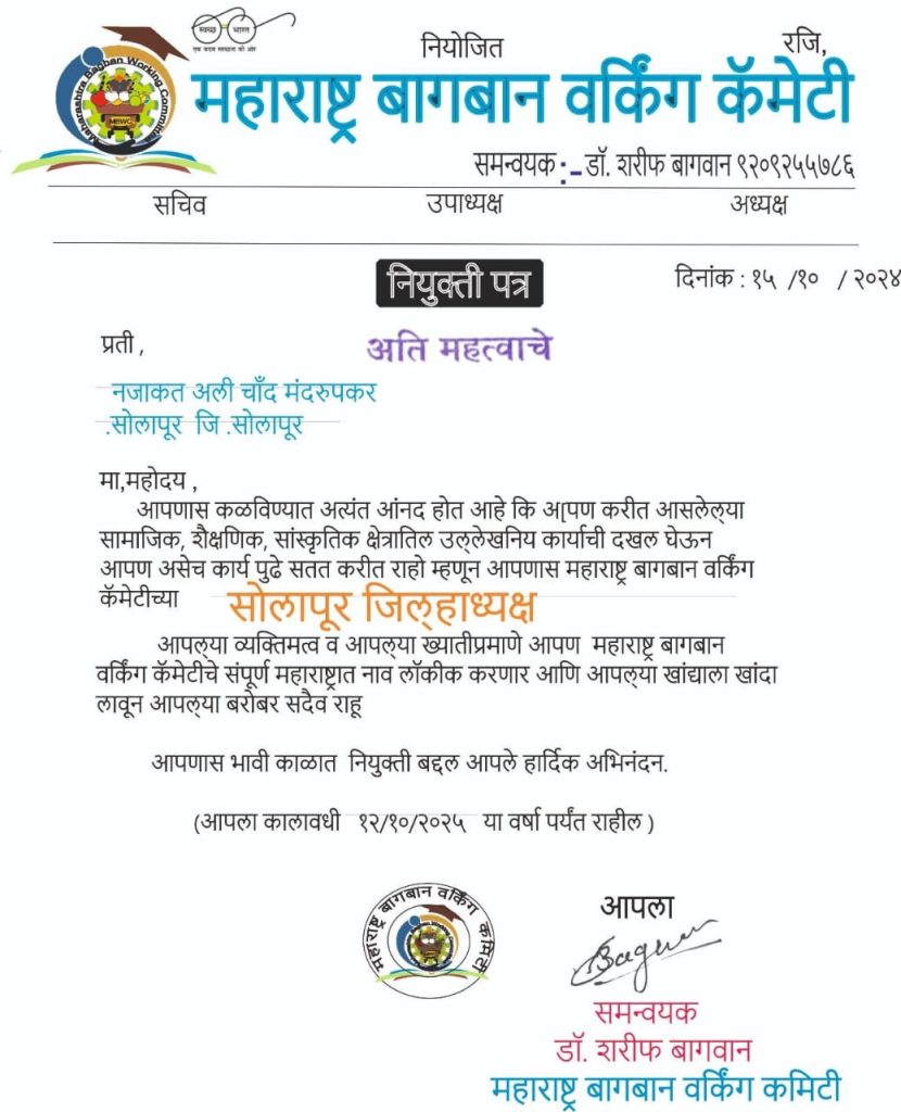 महाराष्ट्र बागबान वर्किंग कमिटी च्या सोलापूर जिल्हा अध्यक्ष पदी नजाकत अली मंदृपकर…