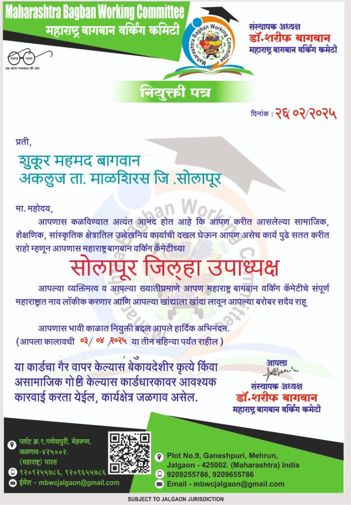 महाराष्ट्र बागवान वर्किंग कमिटी चे प्रमुख डॉ शरीफ बागवान आणि हाजी मुश्ताक बागवान (मोहोळ) यांच्या आदेशाने भैय्या माढेकर याची झालेली निवड भविष्यात ते सार्थ ठरवतील हे मात्र तितकेच खरे…