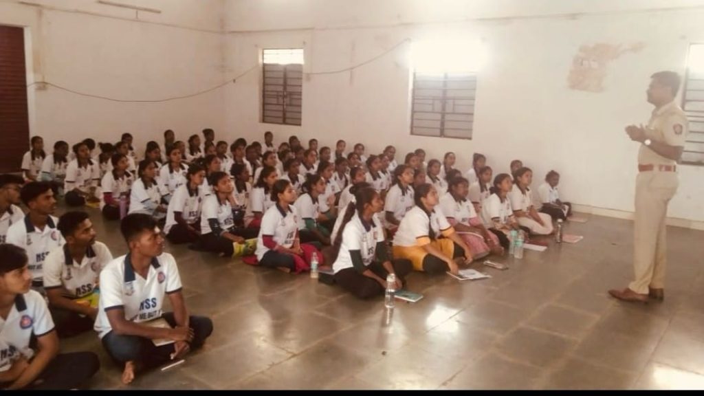 पालघर जिल्हा पोलिसांकडून राबवल्या जाणाऱ्या सायबर गुन्हे मुक्त गाव अभियाना अंतर्गत तांदूळवाडी येथे दांडेकर महाविद्यालयातील विद्यार्थ्यांना मार्गदर्शन करताना सपोनि दत्ता. के. शेळके आणि ॲडव्होकेट कांचन भोईर