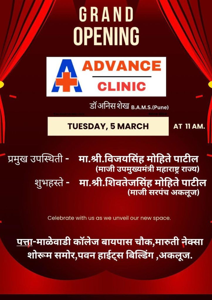 अकलूज येथील डॉ अनिस शेख BAMS यांनी नव्याने सुरु केलेल्या “ॲडवांस क्लिनिक” चे उद्घाटन राज्याचे माजी उपमुख्यमंत्री “विकासरत्न” विजयसिंह मोहिते पाटील यांच्या हस्ते थाटामाटात पार पडले…