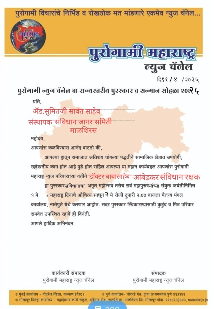 तसेच चालता बोलता जागर संविधानाचा या उपक्रमातून सर्वसामान्य लोकांपर्यंत संविधान पोहचविण्याचे ते काम करीत आहेत, याची दखल घेऊन पुरोगामी महाराष्ट्र न्यूज चॅनेल यांचे वतीने पुरस्कार जाहीर केल्याचे म्हटले आहे…