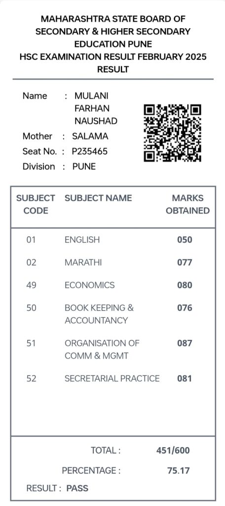 फरहान मुलाणी चे 12 वी च्या (HSC Board) परीक्षेत उत्तुंग यश…