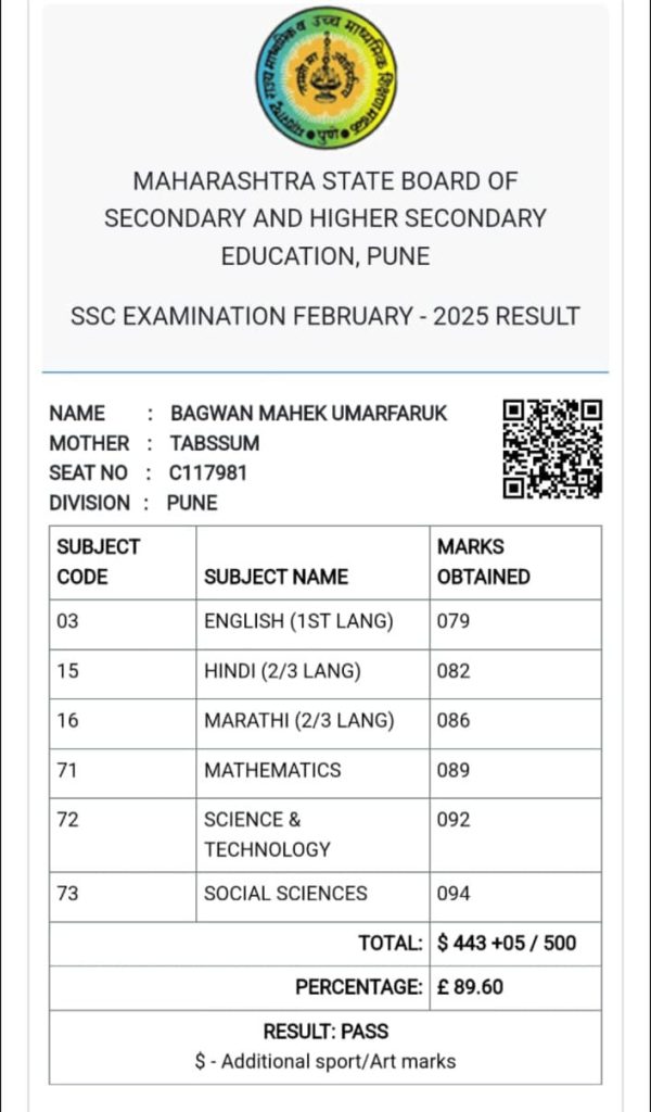 “प्रतापगड” अकलूज चे कट्टर समर्थक रफिकभाई मोहोळकर यांची नात कु महेक उमरफारुख बागवान (मोहोळकर) हिने 2025 च्या फेब्रुवारी/मार्च महिन्यात झालेल्या एस एस सी बोर्डाच्या परीक्षे मध्ये 89.60 टक्के गुण मिळवत घवघवित असे यश संपादन केले…