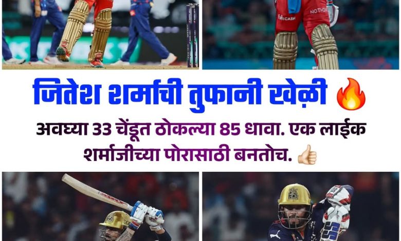 228 धावांचे लक्ष्य गाठण्यासाठी मैदानात उतरलेल्या आरसीबीने सुरुवातीपासूनच आक्रमक पवित्रा घेतला. फिल साल्टने 30 आणि विराट कोहलीने 54 धावा करत धावसंख्या उचलून धरली. मात्र खऱ्या अर्थाने सामना जिंकला तो जितेश शर्मा आणि मयंक अग्रवालने.