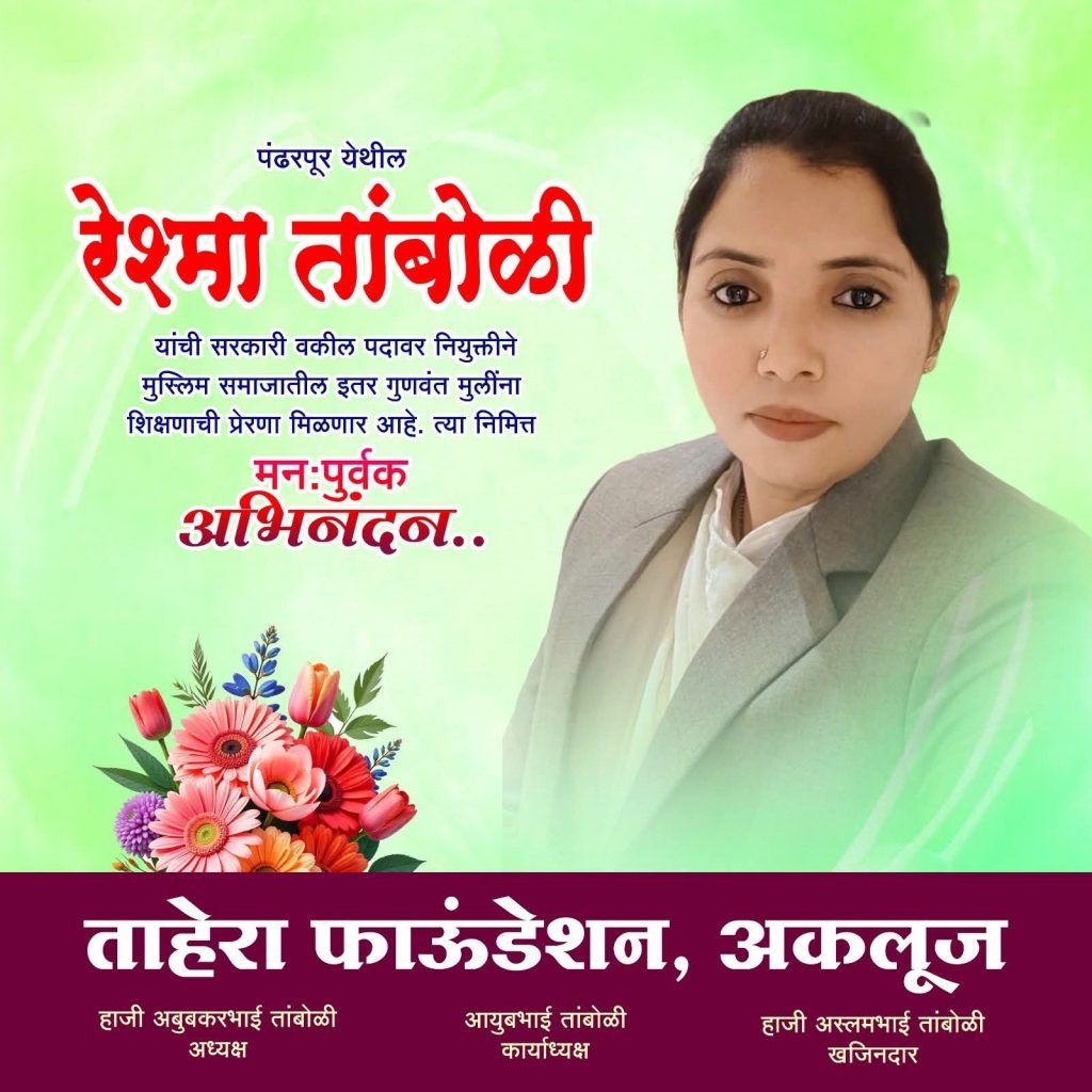 पंढरपूर येथील रहिवाशी असलेल्या ॲड रेश्मा तांबोळी यांची नुकतीच सरकारी वकील पदी निवड झाल्याची माहिती टाइम्स 9 न्यूज च्या सुत्रांनी दिली…