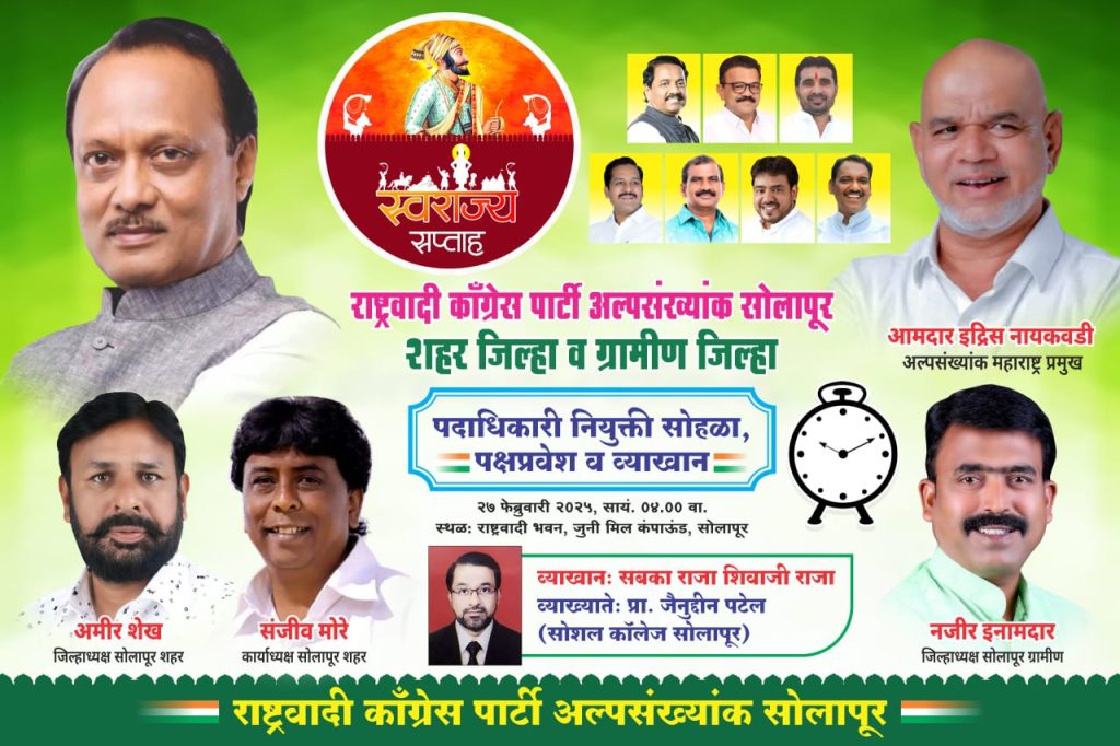 सदर कार्यक्रमाच्या व्यासपिठावर अध्यक्षस्थानी राष्ट्रवादी चे शहर जिल्हा अध्यक्ष संतोष पवार यांच्या सह कार्याध्यक्ष जुबेर बागवान,सोलापूर शहर जिल्हा अध्यक्ष आमीर शेख,अल्पसंख्यांक कार्याध्यक्ष संजीव मोरे,फारुख मडके उपस्थित होते तसेच या कार्यक्रमाचे नेटके नियोजन करणारे पक्षाच्या अल्पसंख्यांक ग्रामीणचे अध्यक्ष नजीर भाई इनामदार हे हि आवर्जून उपस्थित होते…