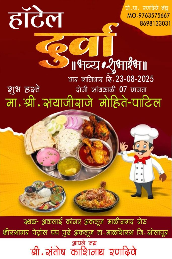 अकलूज येथील हॉटेल दुर्वा या फर्म च्या दुसऱ्या नॉनव्हेज शाखेचे उद्घाटन 23/08/2025 रोजी संध्या 07 वाजता युवा नेते सयाजीराजे मोहिते पाटील यांच्या हस्ते उद्घाटन होणार असल्याची माहिती हॉटेल मालक संतोष रणदिवे यांनी टाइम्स 9 न्यूज शी बोलताना सांगितले…