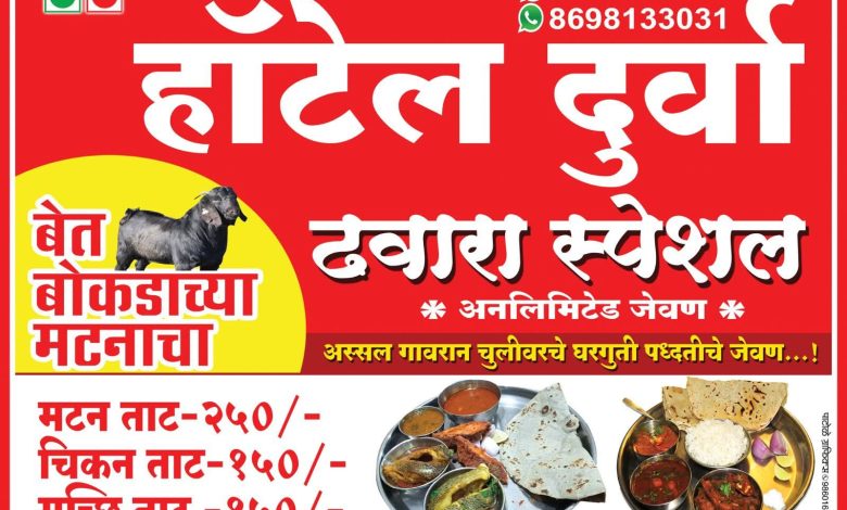 हॉटेल दुर्वा नॉनव्हेज येथे बोकडाचे ढवारा अनलिमिटेड मटन थाळी फक्त 250 रुपया मध्ये मिळणार असून या सोबत गावरान चिकन आणि फ्रेश मच्छी थाळी सुद्धा योग्य दरात मिळणार असल्याचे त्यांनी सांगितले…