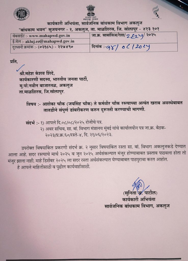 भारतीय जनता पार्टीच्या वतीने सातत्याने केलेल्या पाठपुराव्याला यश मिळाले असून सार्वजनिक बांधकाम विभाग, अकलूज यांच्याकडून अधिकृत उत्तर प्राप्त झाले आहे.