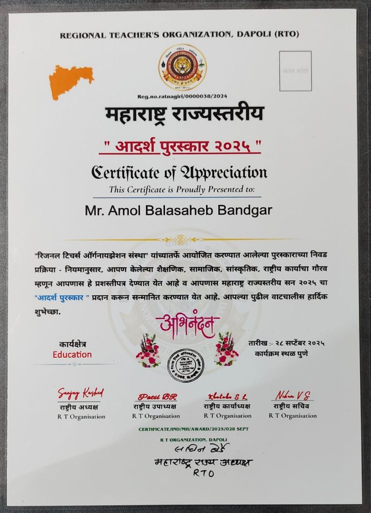 रिजनल टीचर्स ऑर्गनायझेशन,दापोली यांच्या वतीने सन २०२५ साठीचा महाराष्ट्र राज्यस्तरीय आदर्श शिक्षक पुरस्कार श्री चंद्रशेखर विद्यालय व नारायण काका आगाशे कनिष्ठ महाविद्यालय,श्रीपूर येथील जीवशास्त्र विषयाचे प्राध्यापक आणि विद्यार्थि प्रिय शिक्षक अमोल बाळासाहेब बंडगर यांना प्रदान करण्यात आला…