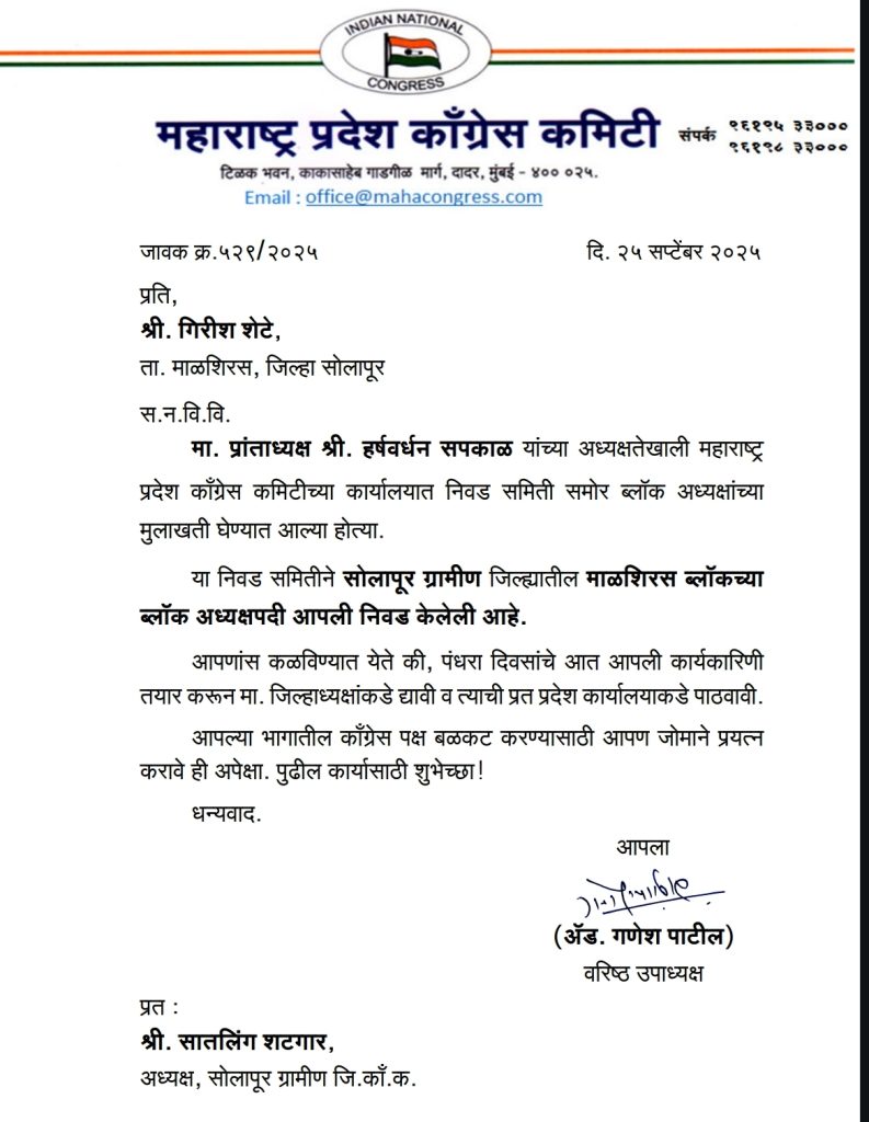 मुंबई येथे झालेल्या एका बैठकीमध्ये निवड समिती समोर ब्लॉक अध्यक्षांच्या मुलाखती घेण्यात आल्या होत्या.या निवड समितीने सोलापूर ग्रामीण जिल्ह्यातील माळशिरस ब्लॉकच्या ब्लॉक अध्यक्षपदी गिरीश शेटे यांची एकमताने निवड केली…