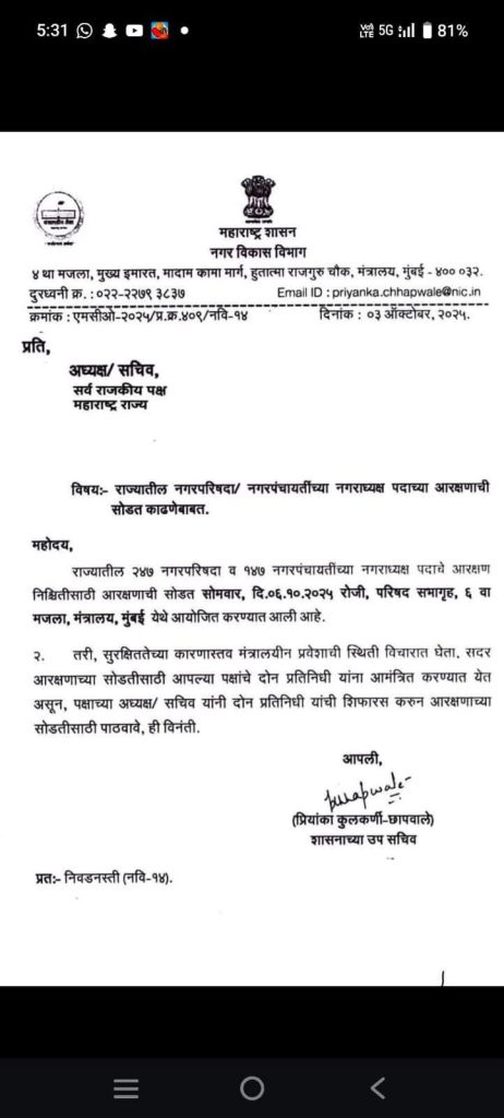 नगर विकास विभागाचे उप सचिव प्रियांकु कुलकर्णी – छपवाळे यांच्या सहीने,दिनांक ०३ ऑक्टोबर,२०२५ रोजी यासंबंधीचे पत्र सर्व राजकीय पक्षांचे अध्यक्ष/सचिव यांना पाठवण्यात आलेले आहे…