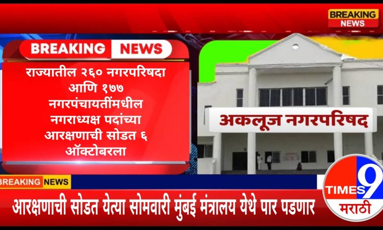 महाराष्ट्रातील नगर परिषद आणि नगर पंचायतीच्या नगराध्यक्षांच्या आरक्षणाची सोडत येत्या सोमवारी मुंबई मंत्रालय येथे पार पडणार