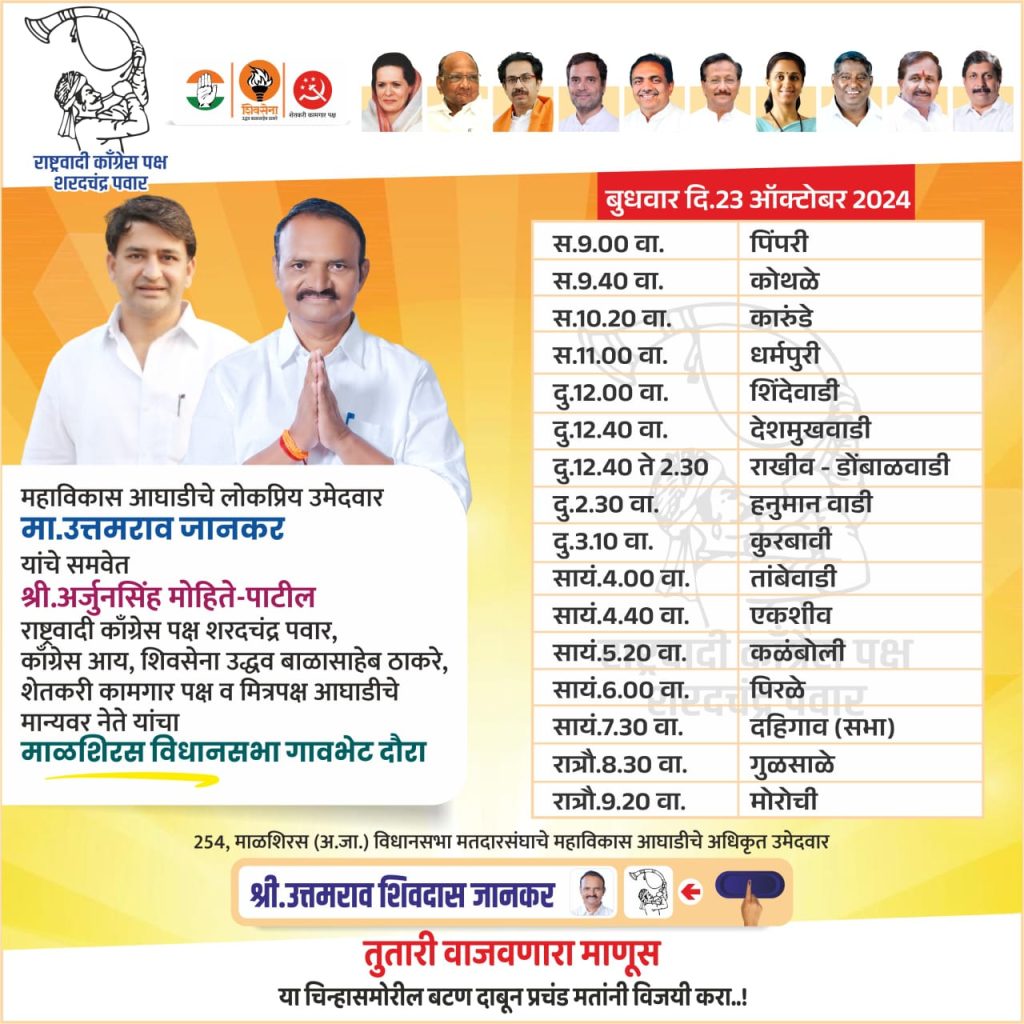 या अनुषंगाने संपूर्ण माळशिरस तालुक्यात उमेदवार उत्तमराव जानकर,युवानेते अर्जुनसिंह मोहिते-पाटील (माजी उपसभापती पंचायत समिती माळशिरस),ज्येष्ठ नेते बाबाराजे देशमुख (माजी उपाध्यक्ष जिल्हा परिषद सोलापूर),संतोष भैय्या राऊत (ता प्र माळशिरस तालुका उबाठा),पै दत्ता मगर (नि मगराचे),साजिदभाई सय्यद,माळशिरस तालुक्यातील महाविकास आघाडीचे सर्वपक्षीय मान्यवर पदाधिकारी यांच्या उपस्थितीत गावभेट दौऱ्याचे आयोजन करण्यात आले असल्याची माहिती हि सुत्रांनी दिली…