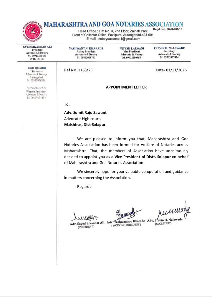 ॲड सुमित सावंत यांच्या नियुक्तीमुळे सोलापूर जिल्ह्यातील नोटरी बांधवांचे प्रश्न,अडचणी आणि तांत्रिक बाबींवरील समन्वय व निराकरण अधिक प्रभावी पद्धतीने होईल,असा विश्वास व्यक्त करण्यात येत आहे.