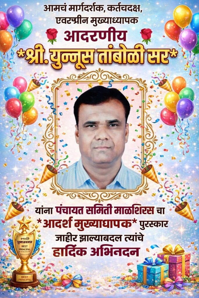 माळशिरस : शिक्षण क्षेत्रातील उल्लेखनीय कार्याची दखल घेत पंचायत समिती माळशिरसच्या वतीने देण्यात येणारा मानाचा ‘आदर्श मुख्याध्यापक’ पुरस्कार श्री. युन्नूस तांबोळी सर यांना जाहीर करण्यात आला आहे. त्यांच्या या निवडीमुळे शैक्षणिक वर्तुळात आनंदाचे वातावरण पसरले असून, त्यांच्यावर अभिनंदनाचा वर्षाव होत आहे.