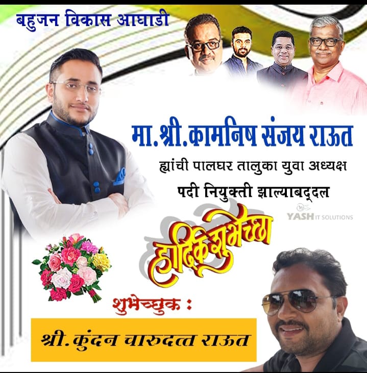 तसेच डिसेंबर 2022 रोजी पालघर तालुक्यात पार पडलेल्या ग्रामपंचायत निवडणुकांपैकी मांडे विठ्ठलवाडी, कांद्रेभुरे,खार्डी दातीवरे, सफाळे उंबरपाडा, सफाळे कर्दळ या ग्रामपंचायतीवर बहुजन विकास आघाडीचा झेंडा फडकवण्यात महत्त्वाची भूमिका पार पाडली या सर्वांची दखल घेऊन पक्षश्रेष्ठीने शनिवार दिनांक 4 मार्च 2023 रोजी श्री.कामनिष संजय राऊत यांची पालघर तालुका युवा अध्यक्ष पदी म्हणून निवड केली आहे.