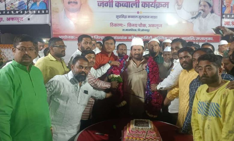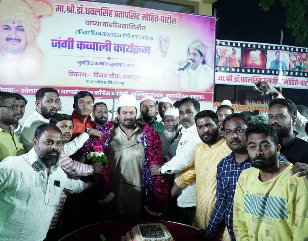 सोलापूर जिल्हा काँग्रेसचे अध्यक्ष डॉ धवलसिंह मोहिते पाटील यांच्या वाढदिवसानिमित्त अकलूज येथे सोलापूर जिल्हा अल्पसंख्यांक काँग्रेस कमिटी आणि मुस्लिम जमात माळशिरस तालुका यांच्यावतीने सुप्रसिद्ध कव्वाल सुलतान नाझा यांचा अकलूज येथील विजय चौकात शानदार कव्वाली कार्यक्रम संपन्न झाला यावेळी डॉ धवलसिंह मोहिते पाटील यांना वाढदिवसानिमित्त सोलापूर जिल्ह्याच्या विविध भागातील नेते पदाधिकारी शुभचिंतक कार्यकर्ते अशा हजारोच्या संख्येने उपस्थित राहून वाढदिवसाच्या शुभेच्छा दिल्या तसेच डॉक्टर धवलसिंह मोहिते पाटील यांच्या वाढदिवसानिमित्त विविध उपक्रम राबवून वाढदिवस साजरा करण्यात आला