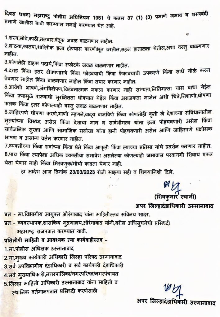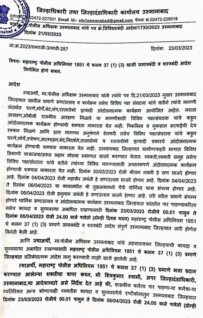 त्याअर्थी, महाराष्ट्र पोलीस अधिनियम 1951 चे कलम 37 (1) (3) प्रमाणे मला प्रदान करण्यात आलेल्या शक्तीचा वापर करुन, मी शिवकुमार स्वामी, अपर जिल्हादंडाधिकारी, उस्मानाबाद,याना आदेशाव्दारे असे निर्देश देत आहे की, शासकीय कर्तव्य पार पाडणा-या कर्मचा या व्यतिरिक्त अन्य कोणत्याही व्यक्तीस कायदा व सुव्यवस्थेचे दृष्टीकोनातुन उस्मानाबाद जिल्हयात दिनांक 23/03/2023 रोजीचे 00.01 पासुन ते दिनांक 06/04/2023 रोजी 24.00 वाजे पावेतो (दोन्ही दिवस धरुन) महाराष्ट्र पोलीस अधिनियम 1951 चे कलम 37 (1) (3) प्रमाणे जमाव व शस्जरबंदी प्रमाणे खालील बाबी करण्यास मनाई करण्यात येत आहे.