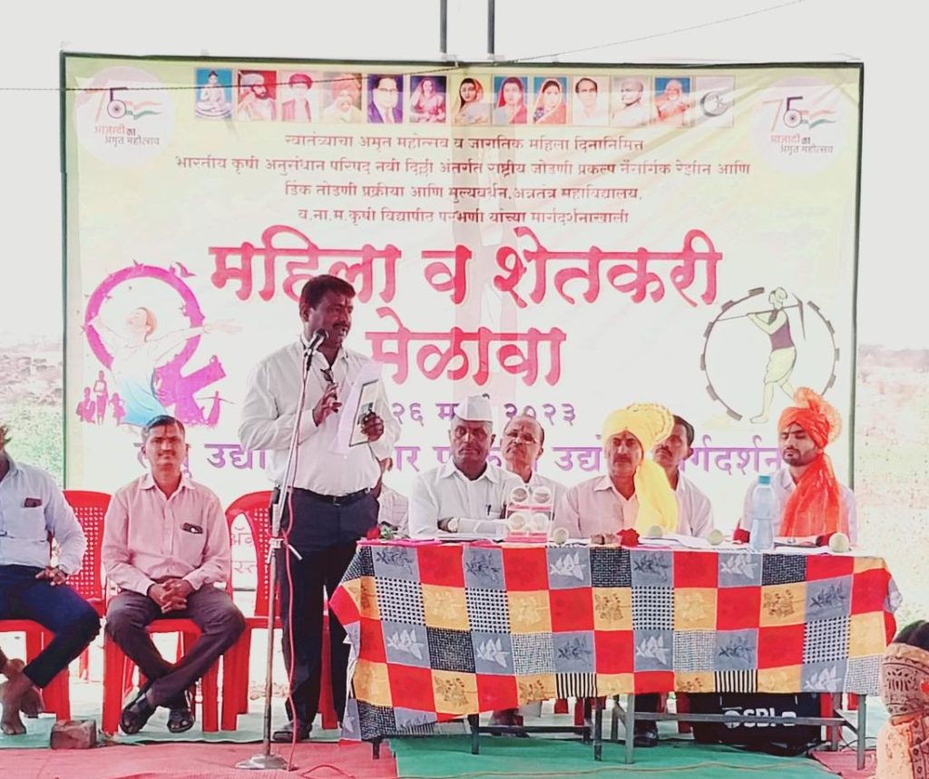 स्वातंत्र्याचा अमृत महोत्सव व जागतिक महिला दिना निमित्त मौजे कारुंडे येथे रविवारी दिनांक २६ मार्च रोजी वसंतराव नाईक मराठवाडा कृषि विद्यापीठ परभणी, भारतीय कृषी अनुसंधान परिषद अंतर्गत राष्ट्रीय जोडणी प्रकल्प नैसार्गिक रेझीन व डीक तोडणी प्रक्रिया व मुल्यवर्धन कृषि अन्नतंत्र महाविद्यालय परभणी, गौतमी महीला अँग्रो फुड प्रॉडक्टस इंडिया प्रा लि कारुंडे , चैतन्य महिला ग्रामसं घ व मंडळ कृषि अधिकारी नातेफते यांचे संयुक्त विद्यमाने कारुंडे ‘ धर्मपरी, पिपरी , कोथळे, गुरसाळे येथील महिला बचत गट यांचा शेतकरी महिलांचा गवार पीक लागवड डींक निर्मिती प्रकल्प , पंतप्रधान सुक्ष्म अन्न प्रक्रिया उदयोग (PM FME ) व बाळासाहेब ठाकरे कृषि संजीवनी प्रकल्प ( स्मार्ट ) या विषयावर संपन्न झाला .