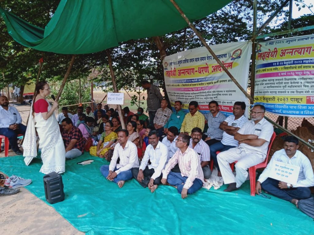राज्यातील शिक्षणाशास्ञ महाविद्यालयांना महाराष्ट्र शासनाने 100 % अनुदान द्यावे या मागणी साठी मुंबईत आझाद मैदानावर आंदोलनाचा 35 वा दिवस