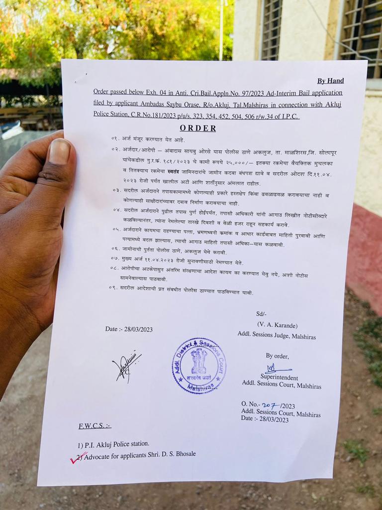 माञ माळशिरस न्यायालयाने आज, आरोपी अंबादास सायबु बोरसे यांना अकलूज पोलीस ठाणे कडून गुन्हा रजिस्टर नंबर 181 2023 चे कामी 25000 इतक्या रकमेच्या वैयक्तिक मुचलक्या वर व तितक्या च रकमेच्या स्वातंत्र जामीनदाराचे जामीन कदबा बंधपञा देऊन आणि सदरील आदेश दिनांक 11 एप्रिल 2023 पर्यंत खालील अटी व शर्ती अमलात आणाव्यातअशा एकूण 9 अटी नुसार जामीन देण्यात आला.