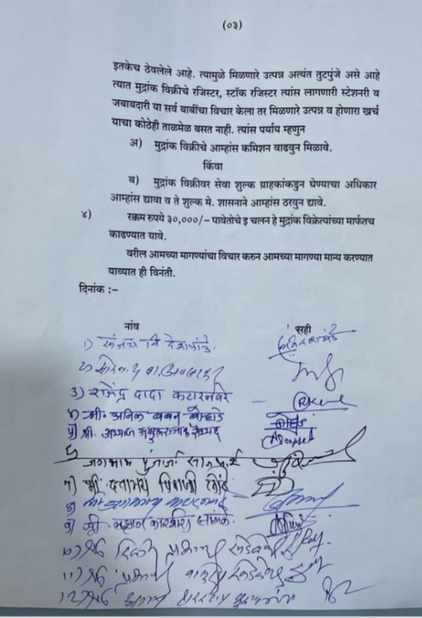तर मिळणारे उत्पन्न व होणारा खर्च याचा कोठेही ताळमेळ बसत नाही तरी मुजरांक विक्रीचे कमिशन वाढवून मिळावे किंवा मुद्रांक विक्रीवर सेवा शुल्क ग्राहकाकडून घेण्याचा अधिकार आम्हास द्यावा व ते शुल्क शासनाने आम्हाला ठरवून द्यावे तसेच रक्कम 30 हजार रुपये पावेतोचे इत्यादी चरण हे मुद्रांक विक्रेत्यांच्या मार्फतच काढण्यात यावे इत्यादी मागण्या या संघटनेने मुख्यमंत्री एकनाथ शिंदे यांच्याकडे निवेदनाद्वारे केले आहे