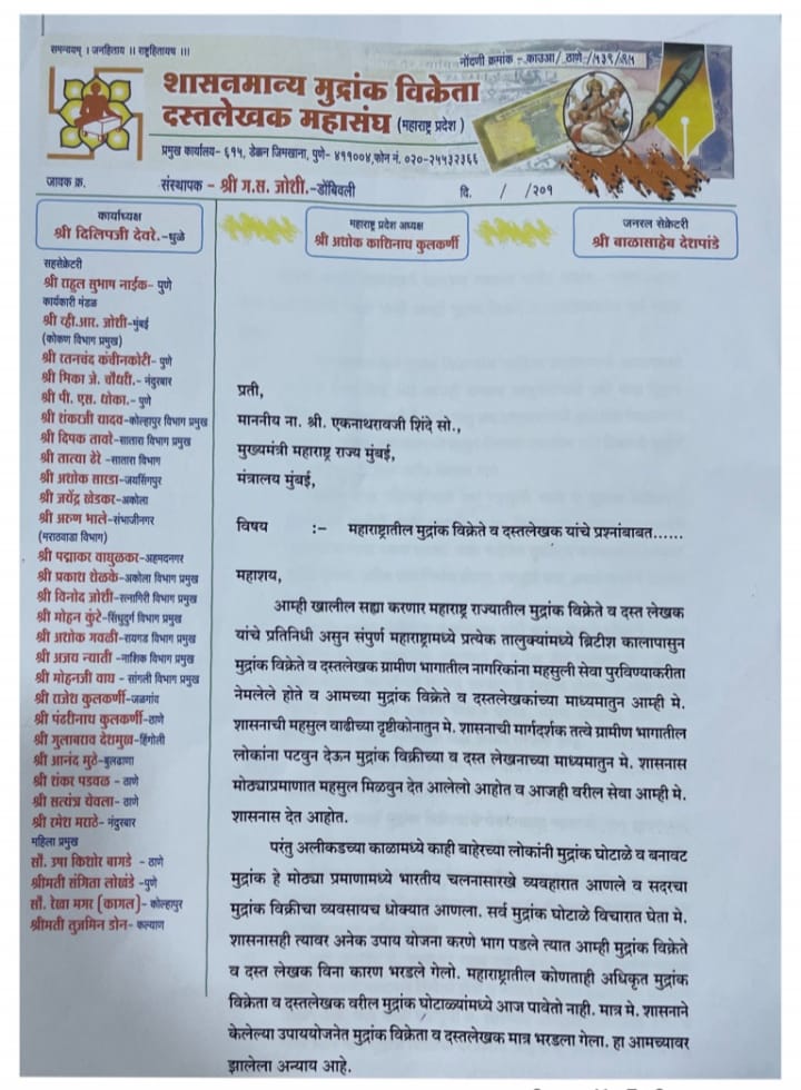 महाराष्ट्रातील मुद्रांक विक्रेते व दस्तलेखक यांच्यावरील अन्यायकारक प्रश्नाबाबत राज्याचे मुख्यमंत्री एकनाथ शिंदे यांना “शासनमान्य मुद्रांक विक्रेता दस्त लेखक महासंघ “–महाराष्ट्र प्रदेश यांच्यावतीने निवेदन देण्यात आले असून महाराष्ट्रातील मुद्रांक विक्रेते व दस्तलेखक संपूर्ण राज्यात प्रत्येक तालुक्यातील ब्रिटिश काळापासून ग्रामीण भागातील नागरिकांना महसुली सेवा पुरवण्याकरिता नियुक्ती केली होती