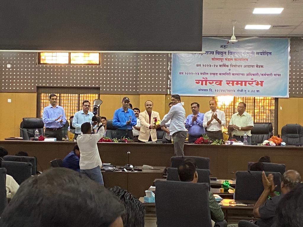 दिनांक 10-4-2023 रोजी सोलापूर जिल्हा नियोजन भवन या ठिकाणी उत्कृष्ट काम केलेल्या महाराष्ट्र राज्य विद्युत वितरण कंपनीतील विज अभियंताचा गुणगौरव माननीय अधीक्षक अभियंता सांगळे साहेब कार्यकारी अभियंता कुऱ्हाडे साहेब यांच्या हस्ते करण्यात आला.