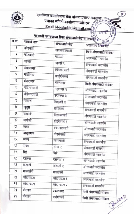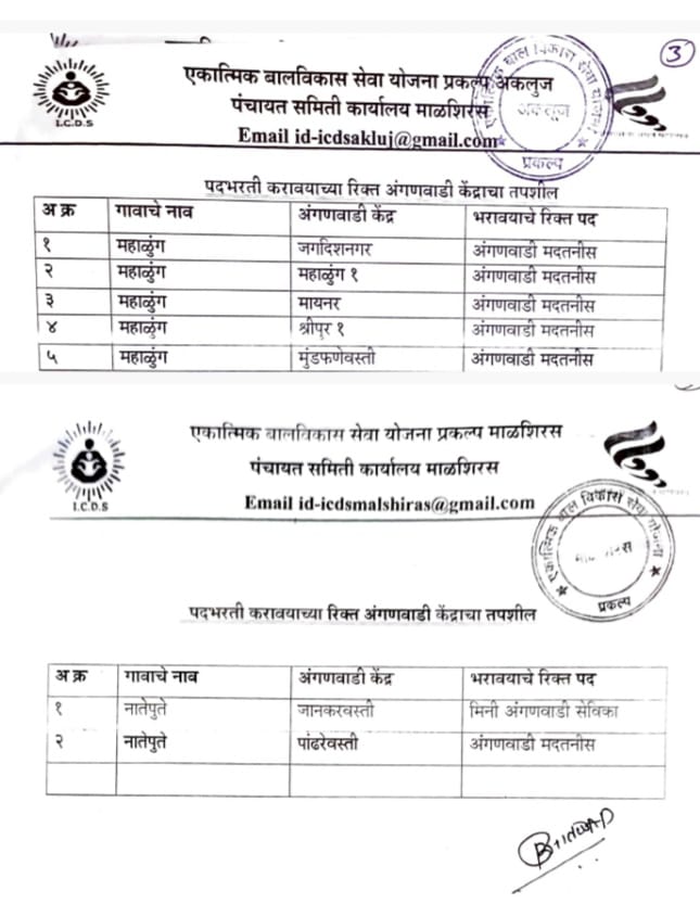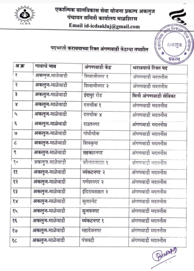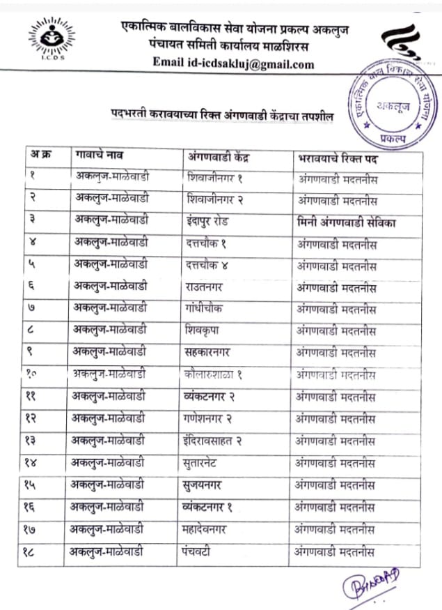 याप्रमाणे रिक्त पदाची भरती करण्या करिता सदर गावातील/नगरपंचायत/नगरपालिका मधील वय वर्षे १८ ते ३५ वर्षे व विधवाकरता ४० वर्षे या वयोगटातील किमान शैक्षणिक पात्रता १२ वी. उत्तीर्ण राज्य शिक्षण मंडळ अथवा त्यास समकक्ष) इच्छुक महिला उमेदवाराकडुन दि.०८/०५/२०२३ ते १९/५/२०२३ या कालावधीत कार्यालयीन वेळेत एकात्मिक बालविकास सेवा योजना प्रकल्प कार्यालय माळशिरस व अकलुज, पंचायत समिती माळशिरस ता.माळशिरस येथे अर्ज स्विकारण्यात येत आहेत. तरी सदर गावातील इच्छुक महिला उमेदवारांनां संपुर्ण कागदपत्रासह अर्ज सादर करण्याचे आवाहन श्री.बालाजी आल्लडवाड, बालविकास प्रकल्प अधिकारी माळशिरस अकलुज यांनी केले आहे.