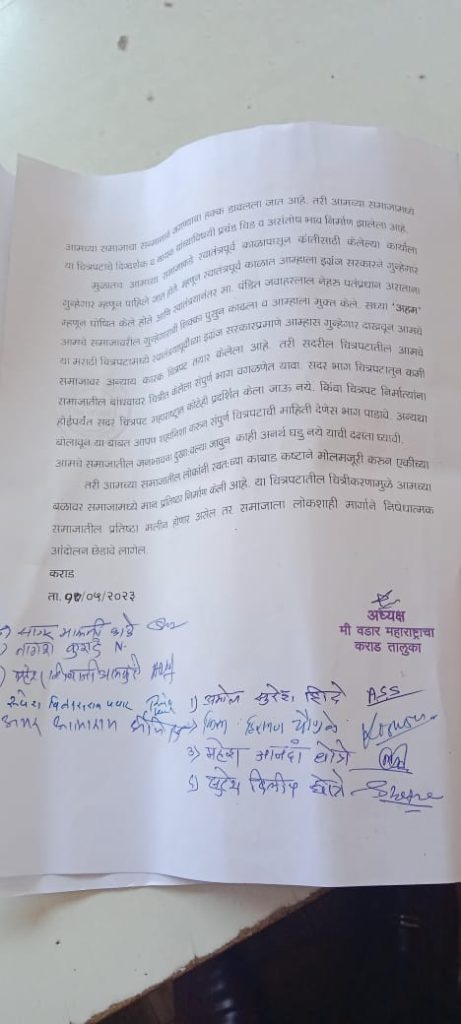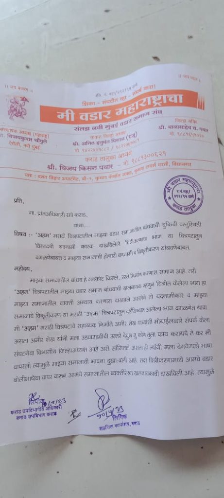 “अहम” या मराठी चित्रपटात वडार समाजाबाबत चुकीची व बदनामीकारक वस्तुस्थिती दाखवली असून या चित्रीकरणाचा भाग चित्रपटातून वागळावे आणि वडार समाजाची होणारी बदनामी विकृतीकरण थांबवावी अन्यथा 12 मे 2023 रोजी महाराष्ट्रात प्रदर्शित होणारा चित्रपट प्रदर्शित होऊ देणार नाही